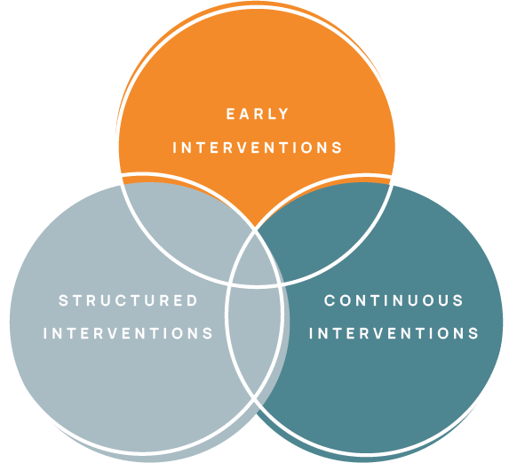 Mae gennym ymagwedd system gyfan at ein darpariaeth gwasanaeth o Ymyriadau Cynnar Cymunedol, Ymyriadau Strwythuredig hyd at Ymyriadau Parhaus. Rydym yn gwneud hyn drwy ddarparu: